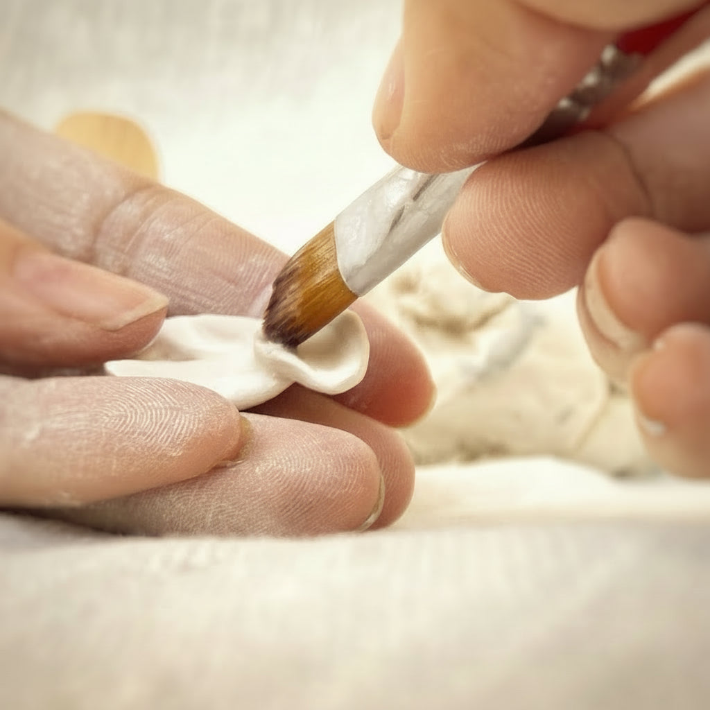 A través de un minucioso pulido manual con punta de diamante, transformamos la superficie de la porcelana hasta alcanzar una textura satinada, suave al tacto y con un brillo orgánico que nace del propio material.