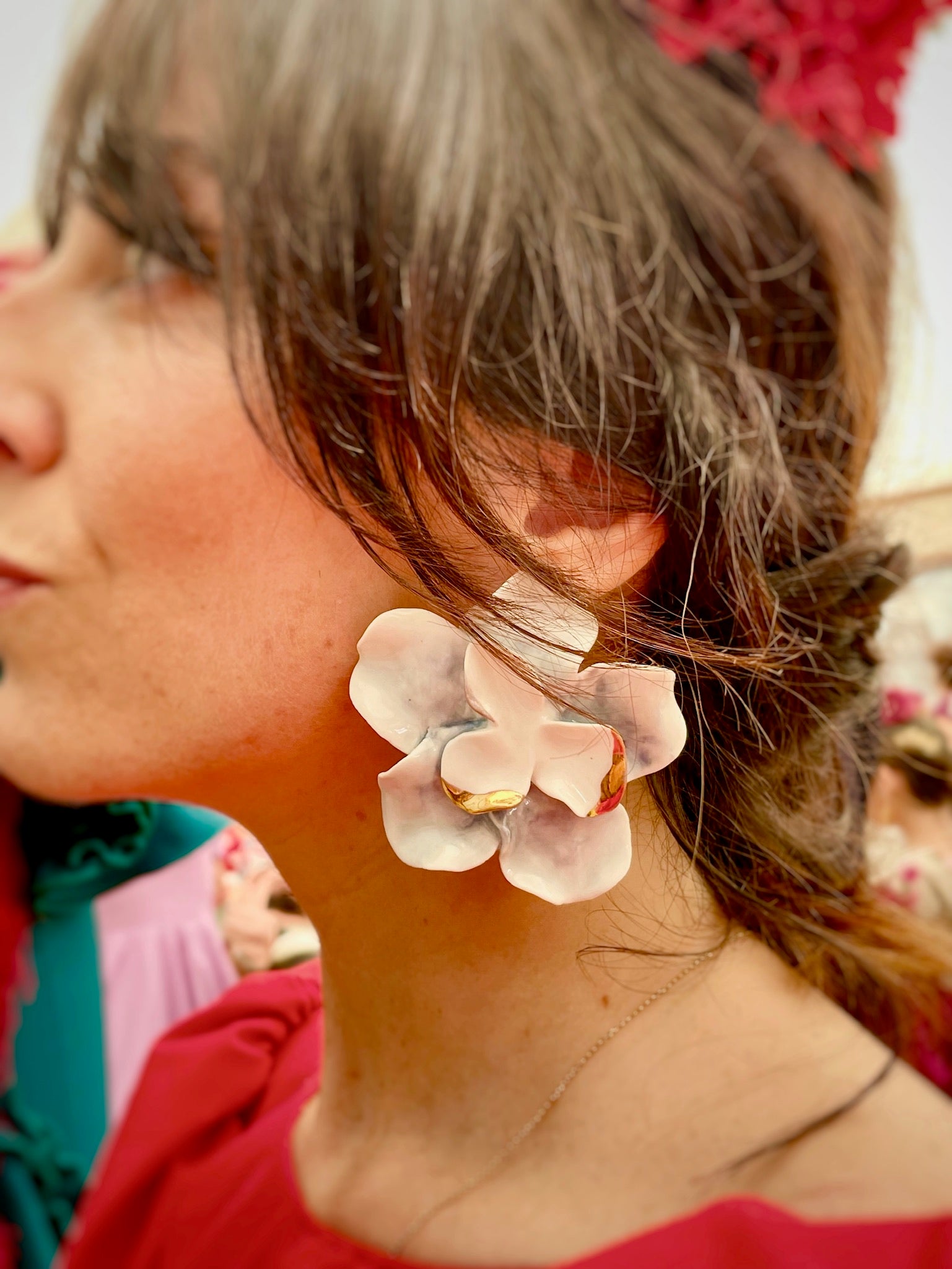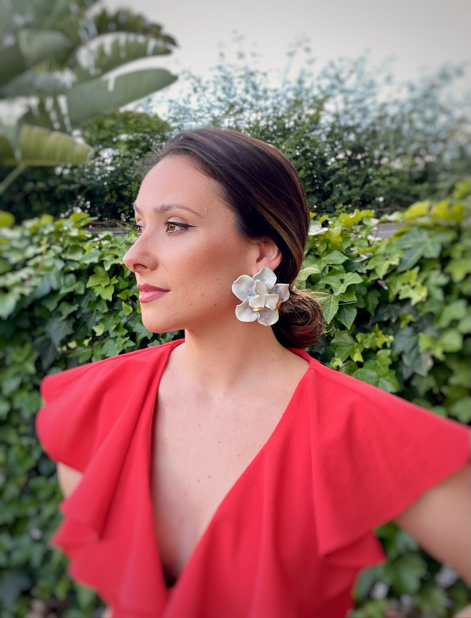 pendientes de porcelana modelada en forma de flor de Jara, dispuesta en dos capas. Hecho a mano. Tamano Grande. Fornitura de plata de ley bañada en oro de 18K. Esmaltado en color blanco natural y detalles en color azul oceano y oro.