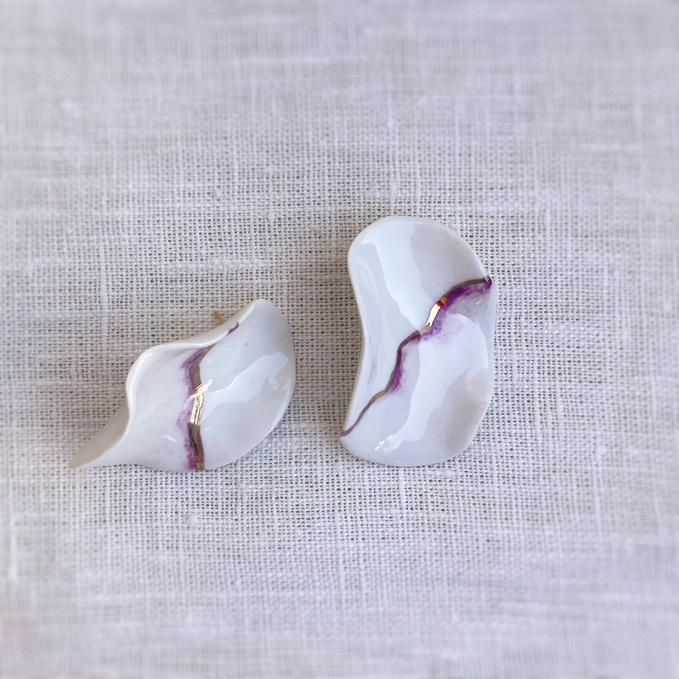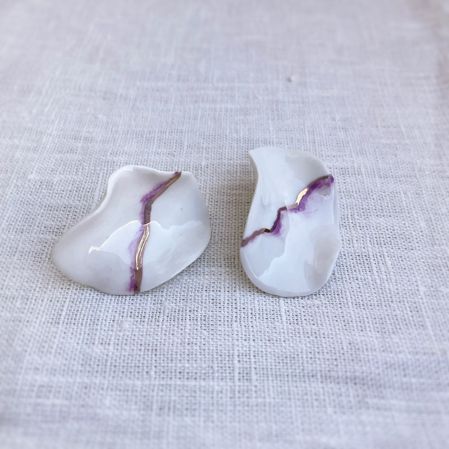 Pendientes realizados con lamina de porcelana ondulada, hecho a mano. Tamano grande. Fornitura de plata de ley bañada en oro de 18K. Esmaltado en color blanco natural, difuminado en color morado y línea en Oro.